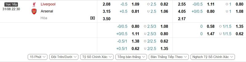 Bảng Tỷ lệ kèo bóng đá Liverpool vs Arsenal