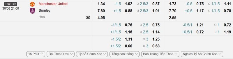 Bảng Tỷ lệ kèo bóng đá Manchester United vs Burnley