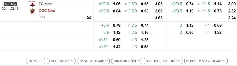 Bảng Tỷ lệ kèo bóng đá Metz vs Nice