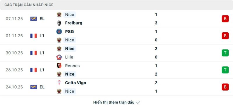 5 trận gần nhất của Nice: L-L-W-W-L