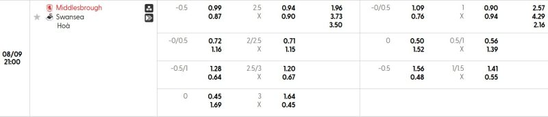 Bảng Tỷ lệ kèo bóng đá Middlesbrough vs Swansea City