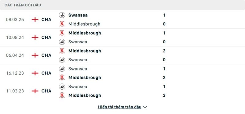 Thành tích đối đầu của Middlesbrough vs Swansea City