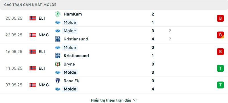 5 trận gần nhất của Molde FK: L-D-L-W-W
