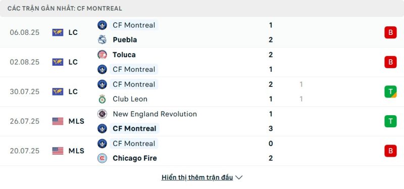 5 trận gần nhất của CF Montréal: L-L-D-W-L