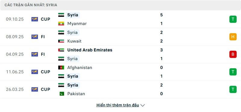 5 trận gần nhất của Syria: W-D-L-W-W