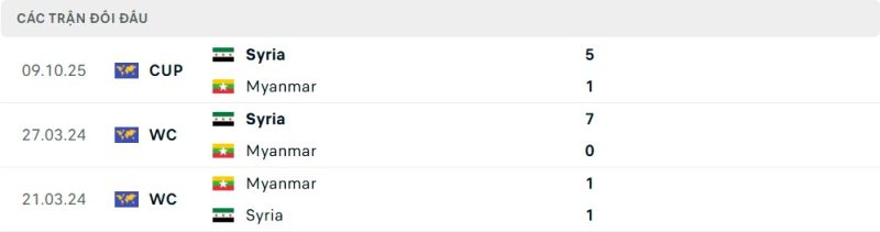 Thành tích đối đầu của Myanmar vs Syria