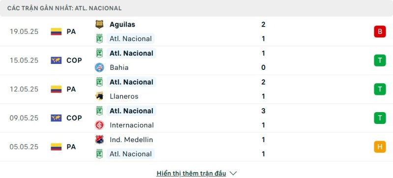 Thống kê phong độ gần đây Nacional vs Atlético Nacional