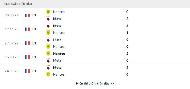Bảng Tỷ lệ kèo bóng đá Nantes vs Metz