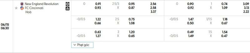 Bảng Tỷ lệ kèo bóng đá New England Revolution vs FC Cincinnati