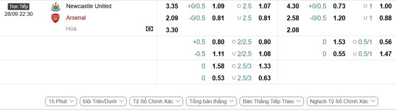 Bảng Tỷ lệ kèo bóng đá Newcastle United vs Arsenal