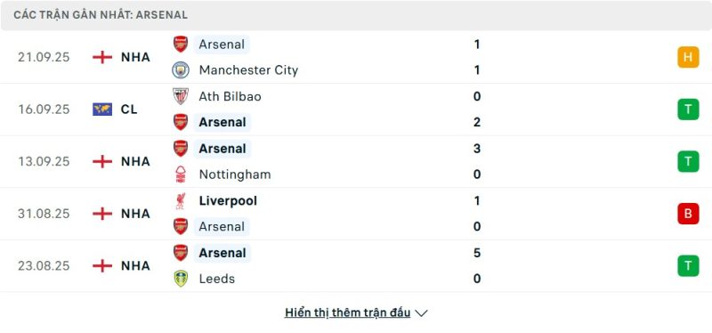 Arsenal đang thể hiện phong độ cao và ổn định khi thắng 3, hòa 1 và chỉ thua 1 sau 5 vòng đấu, hiện đứng ở nhóm dẫn đầu. Họ đã có những chiến thắng quan trọng trước Manchester United, Leeds và Nottingham Forest, đồng thời cầm hòa Man City trong một trận cầu căng thẳng. Đặc biệt, chiến thắng thuyết phục trước Athletic Club ở Champions League càng củng cố niềm tin cho thầy trò Mikel Arteta. Dù thất bại trước Liverpool có phần đáng tiếc, nhưng nhìn chung Arsenal vẫn duy trì được sự chắc chắn trong lối chơi, cho thấy họ là ứng cử viên hàng đầu ở mùa giải năm nay.