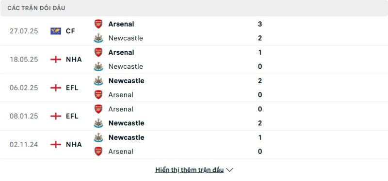 Thành tích đối đầu của Newcastle United vs Arsenal