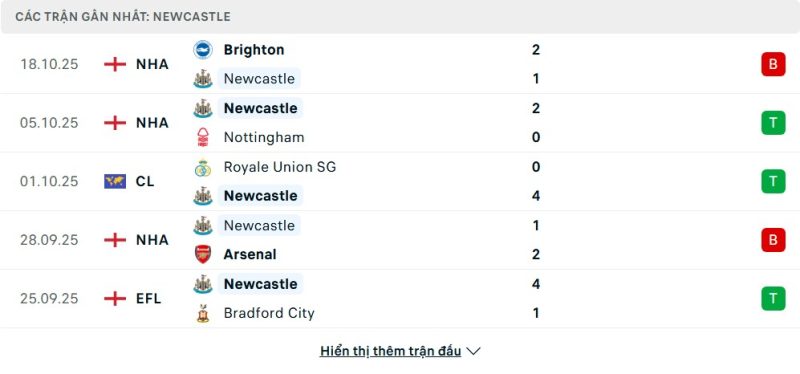 5 trận gần nhất của Newcastle United: L-W-W-L-W