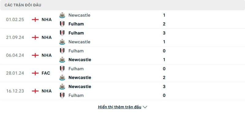 Thành tích đối đầu của Newcastle United vs Fulham