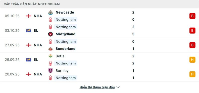 5 trận gần nhất của Nottingham Forest: L-L-L-D-D