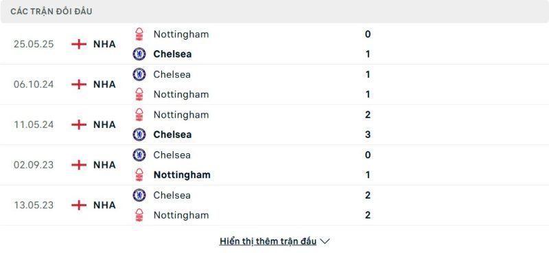 Thành tích đối đầu của Nottingham Forest vs Chelsea