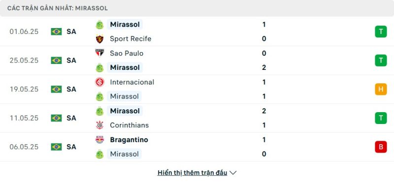 5 trận gần nhất của Mirassol: W-W-D-W-L