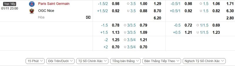 - Kèo tỷ số bóng đá hiệp 1: Paris Saint-Germain 3-1 Nice