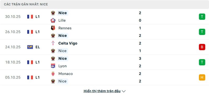 5 trận gần nhất của Nice: W-W-L-W-D