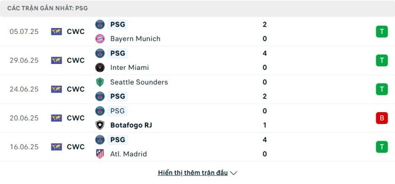 5 trận gần nhất của Paris Saint-Germain: W-W-W-L-W