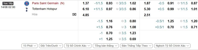 • Kèo tỷ số bóng đá hiệp 1: Paris Saint-Germain 3-0 Tottenham Hotspur