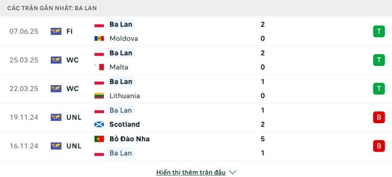 5 trận gần nhất của Ba Lan: W-W-W-L-L