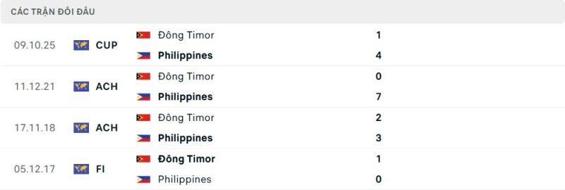 Thành tích đối đầu của Philippines vs Timor-Leste