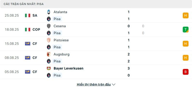 Pisa đang tạm đứng ở vị trí thứ 11 trên bảng xếp hạng với 1 điểm, nhưng trận hòa 1-1 ngay trên sân của đối thủ mạnh là Atalanta ở vòng đấu mở màn là một kết quả đáng khích lệ. Điều này cho thấy đội chủ nhà không phải là một đối thủ dễ bị bắt nạt. Trước đó, họ cũng đã thể hiện được bản lĩnh khi vượt qua Cesena trên chấm luân lưu tại đấu trường Coppa Italia. Chuỗi trận giao hữu mùa hè của Pisa cũng khá ấn tượng với những chiến thắng cách biệt, cho thấy họ có sự chuẩn bị kỹ lưỡng.