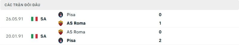 Thành tích đối đầu của Pisa vs Roma