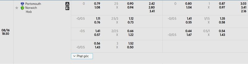 Bảng Tỷ lệ kèo bóng đá Portsmouth vs Norwich City