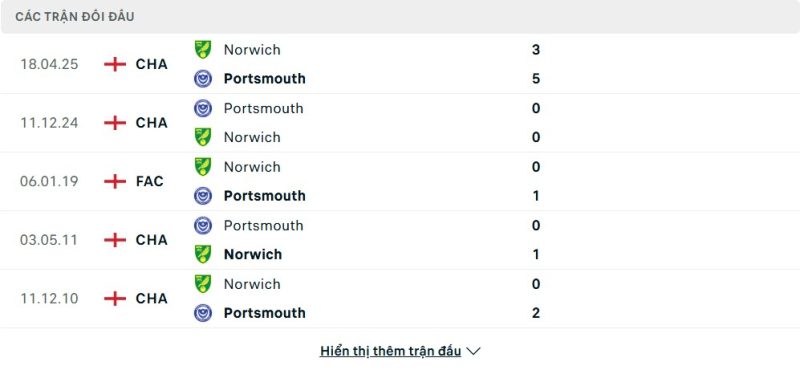 Thành tích đối đầu của Portsmouth vs Norwich City