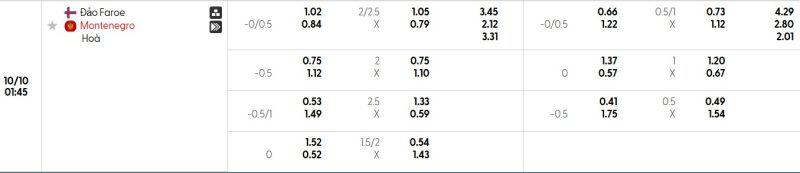 Bảng Tỷ lệ kèo bóng đá Quần đảo Faroe vs Montenegro