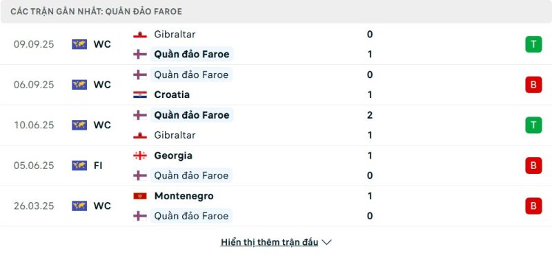 5 trận gần nhất của Quần đảo Faroe: W-L-W-L-L