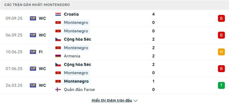 5 trận gần nhất của Montenegro: L-L-D-L-W
