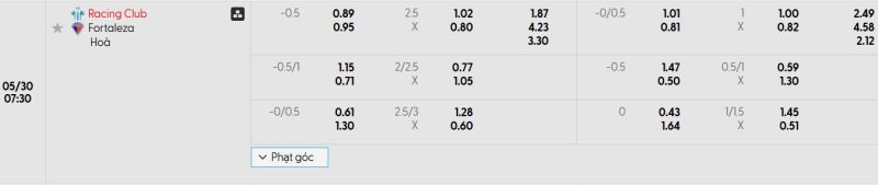 Bảng Tỷ lệ kèo bóng đá Racing Club vs Fortaleza