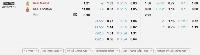 • Kèo tỷ số bóng đá hiệp 1: Real Madrid 2-0 Espanyol