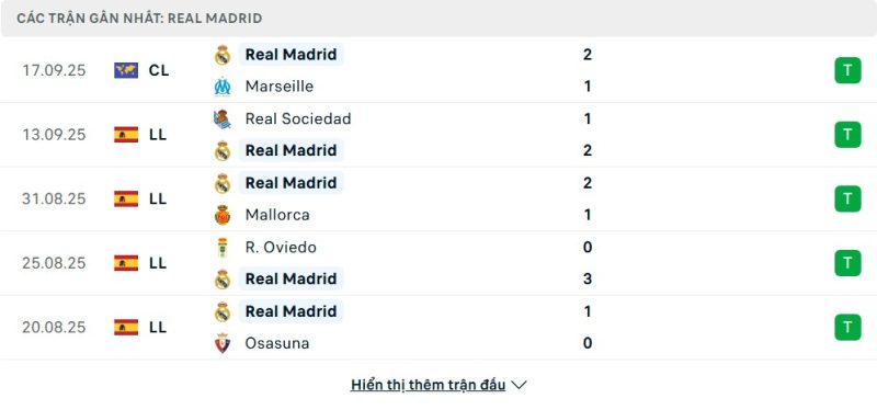 5 trận gần nhất của Real Madrid: W-W-W-W-W