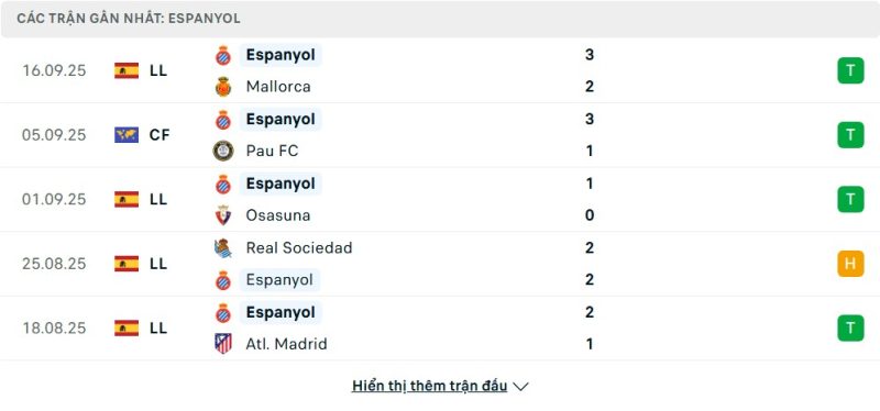 5 trận gần nhất của Espanyol: W-W-W-D-W