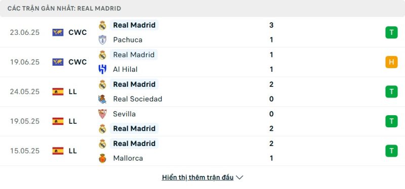 5 trận gần nhất của Real Madrid: W-D-W-W-W