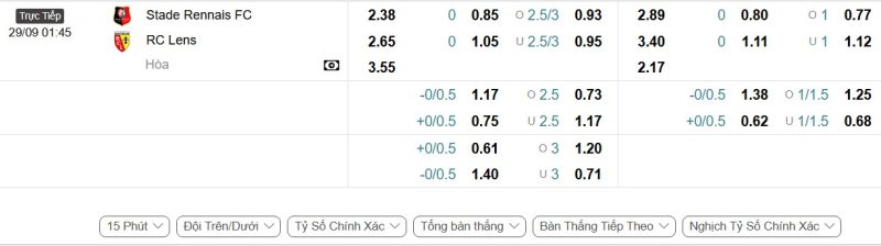 Bảng Tỷ lệ kèo bóng đá Rennes vs Lens