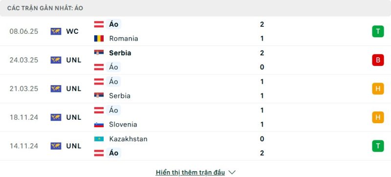 5 trận gần nhất của Áo: W-L-D-D-W