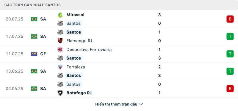 5 trận gần nhất của Santos: L-W-W-W-L