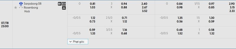 Bảng Tỷ lệ kèo bóng đá Sarpsborg vs Rosenborg