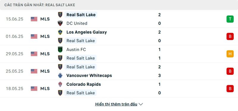 5 trận gần nhất của Real Salt Lake: W-L-D-L-L