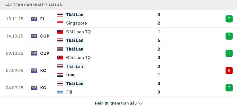 5 trận gần nhất của Thái Lan: W-W-W-L-W
