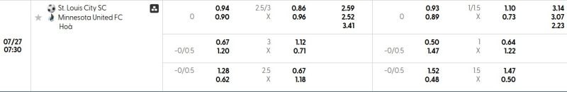Bảng Tỷ lệ kèo bóng đá St. Louis City vs Minnesota United