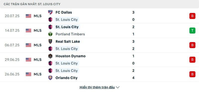5 trận gần nhất của St. Louis City: L-W-L-L-L