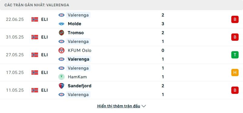 5 trận gần nhất của Vålerenga IF: L-L-W-D-L