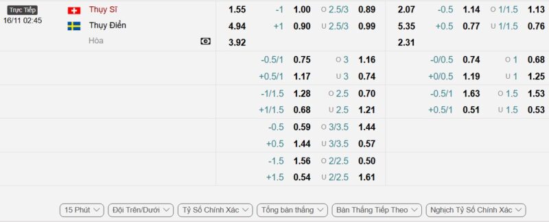 Bảng Tỷ lệ kèo bóng đá Thụy Sĩ vs Thụy Điển