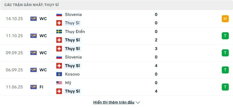 Thống kê phong độ gần đây Thụy Sĩ vs Thụy Điển